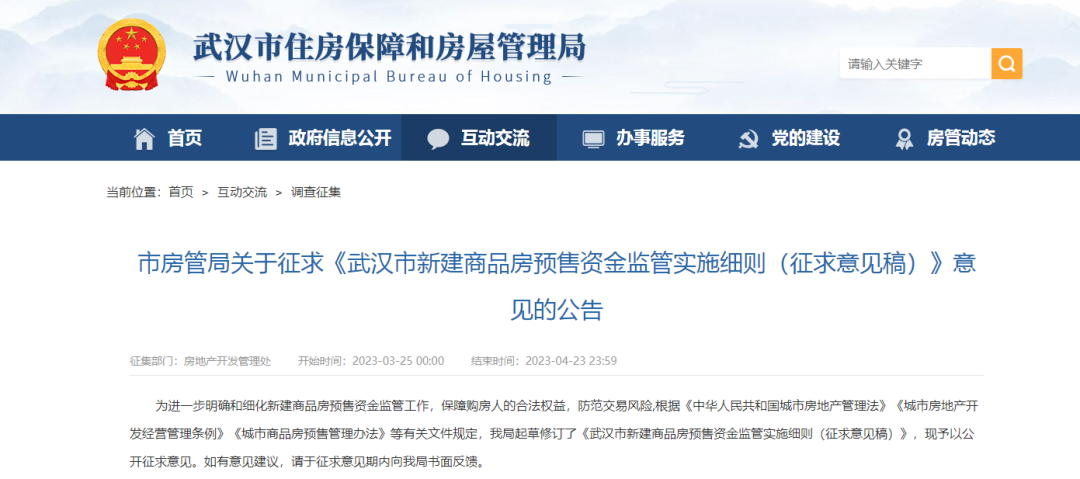 发布了市房管局关于征求《武汉市新建商品房预售资金监管实施细则(征求意见稿)》