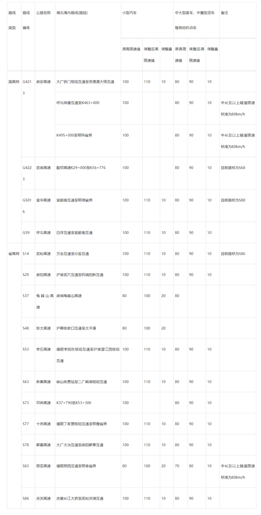 2020年及以后通车的高速公路,小型汽车原最高限速值为80km/h的路段,原则上提高至100km/h;小型汽车原最高限速值为100km/h的路段,原则上提高至110km/h;中大型客车、中重型货车等其他车辆原则上提高至90km/h。