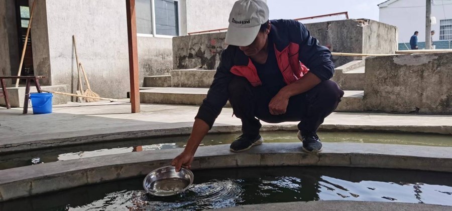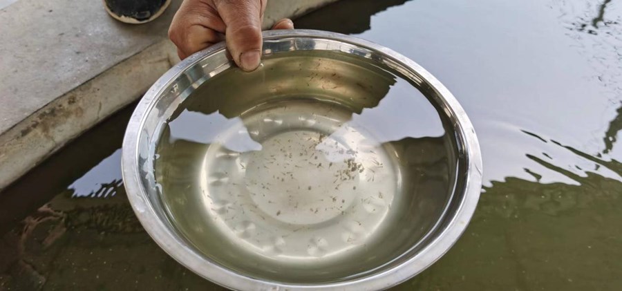4月11日,在白鹭湖管理区水科所,工作人员正舀起一碗流水,观察着水中漂浮的鱼卵和长丰鲫“水花”的成活率。