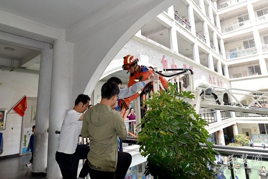 “火灾”发生后,学校立即启动应急疏散预案:由老师组织学生有序疏散、安保人员进行初期火灾扑救,同时拨打119电话报警。消防人员到场后迅速开展灭火救援,并利用云梯消防车成功解救两名行动不便的被困高楼层的学生。