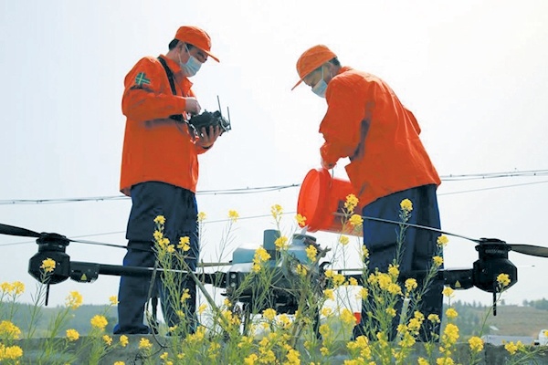 4月7日,在郧阳区安阳镇,“飞防”专业技术人员利用植保无人机在田间进行喷洒作业。