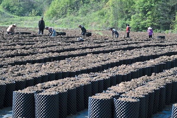 4月10日,郧阳区谭家湾镇黄畈村农民在制作大营养钵,种植中药材。该村建立“联农带农”机制,联合农户成立中药材种植合作社,发展成为远近闻名的中药材种植专业村,壮大村集体经济,扩宽群众增收致富渠道。特约记者王涛摄