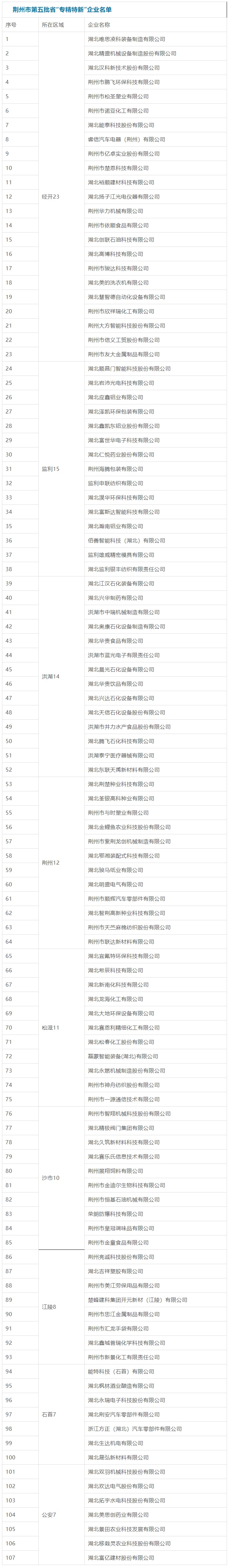 近日,省经信厅公布湖北省第五批专精特新中小企业名单,我市107家企业上榜,入选的企业中,荆州经开区23家、监利市15家、洪湖市14家、荆州区12家、松滋市11家、沙市区10家、江陵县8家、石首市7家、公安县7家。截至目前,我市省级以上专精特新企业已达246家。