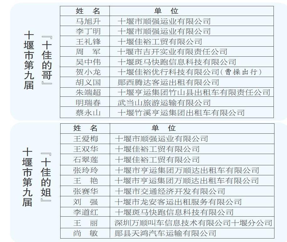 为深入推进我市出租汽车行业文明创建,不断提升出租汽车行业服务质量和水平,充分展示广大出租汽车驾驶员爱岗敬业、诚信经营、文明服务的良好风貌和遵纪守法、助人为乐、见义勇为的职业操守,市创文办、市委文明办、市交通运输局在全市开展十堰市第九届“十佳的哥”“十佳的姐”评选活动。经各地各单位宣传发动、层层推荐、联合评审、网上公示等程序,评选出十堰市第九届“十佳的哥”“十佳的姐”20名予以表扬。