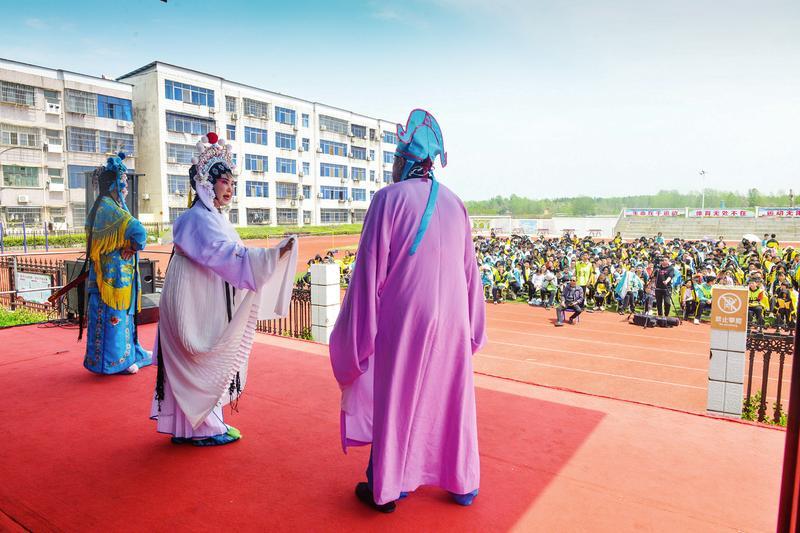 随州高新区注重抓好非物质文化遗产传承工作。日前,由市文化和旅游局、高新区社会事务局主办,淅河镇人民政府、高新区文化馆、淅河镇综合文化站承办的“启航新征程,再创新辉煌”2023年非遗传承送戏曲进校园活动,走进淅河镇中心学校,受到师生欢迎。 (随州日报全媒记者孙洪涛、通讯员王涛摄)