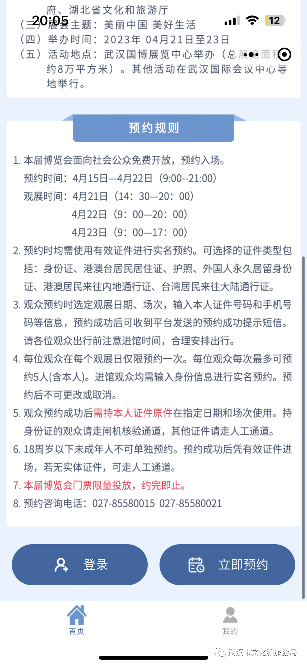 关注「武汉市文化和旅游局」微信公众号,在公众号主页菜单栏左下角点击“观展预约-文旅博览会预约”即可进入预约页面。