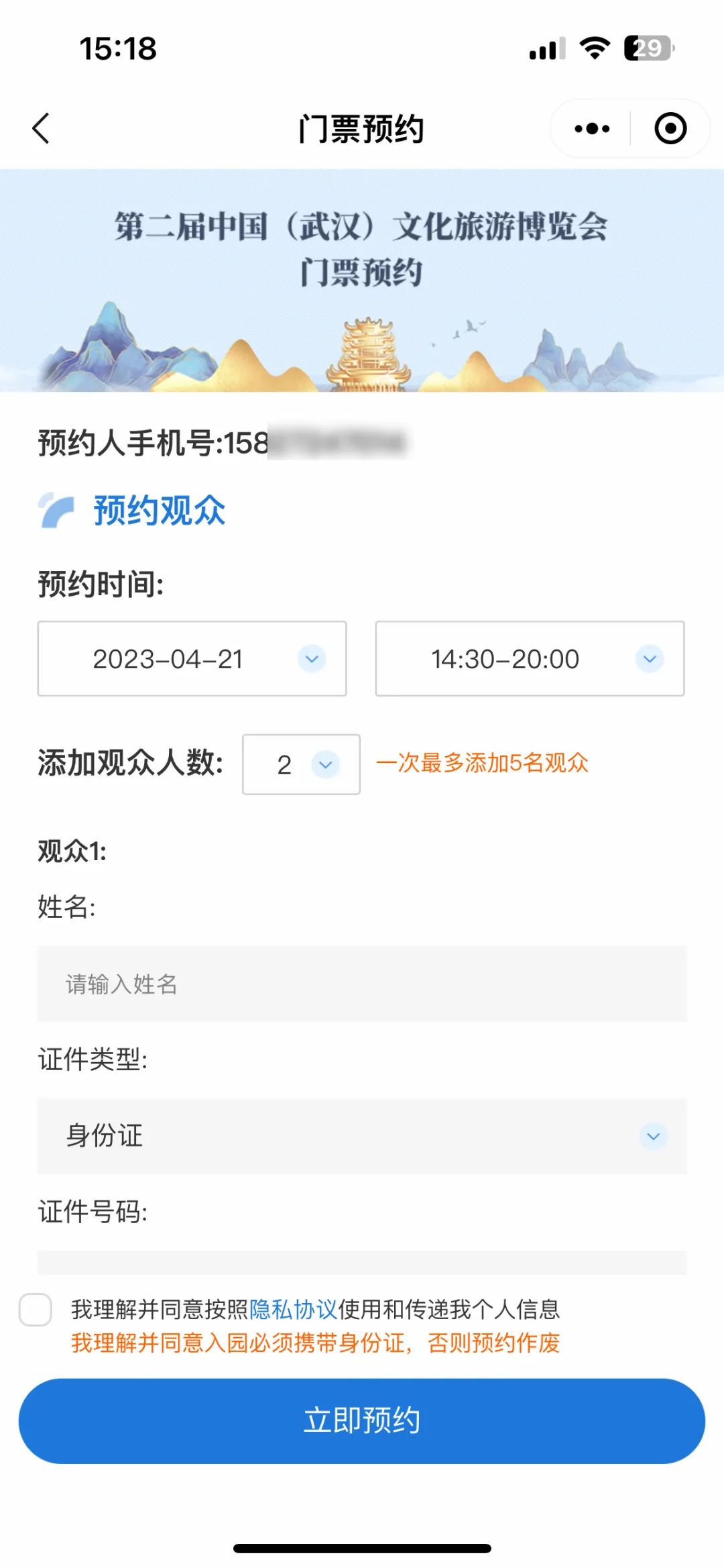 △ 预约信息填写页示意图。需选择预约时间、场次、人数,并填写每个预约人的姓名、证件类型、证件号码进行预约。