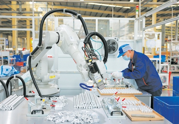 4月14日,在湖北美瑞特空调系统有限公司车间,工人正操作机械臂生产汽车空调系统配件。今年以来,该公司投入400多万元研发新能源汽车空调系列产品3个,产值较去年同期增长30%。记者刘旻摄