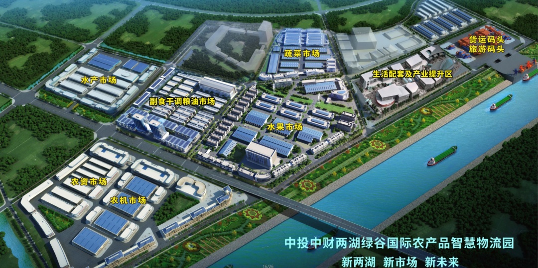 中投中财两湖绿谷国际农产品智慧物流园项目总投资31.5亿元,建成后,将集农产品交易集散中心、服务保障区、商务展示区、生活配套区四大版块于一体,成为一个现代化、智能化、 数字化、绿色化的全国农产品现代流通示范园区和转型升级标杆市场。