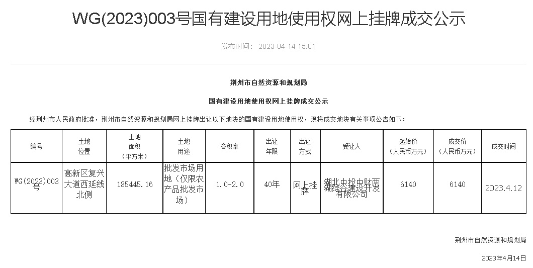 就在上周!荆州高新区又一地块WG(2023)003号以6140万元成功出让!