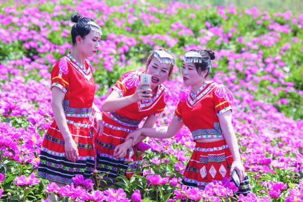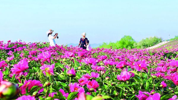 4月15日,以“‘乡’约仙居红 芍‘YAO’你最美”为主题的芍药花节在东宝区中药材示范产业园仙居乡黑峪村中药材种植基地开幕。图为游客在美不胜收的芍药花海中尽情放飞自我。(代欣欣 摄)