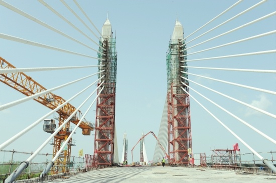 荆州至李埠沿江一级公路江汉运河矮塔斜拉桥是湖北沿江一级公路首座斜拉桥,2020年10月开工,大桥全长626米,桥面宽12.75米,桥塔索面呈竖琴型布置。
