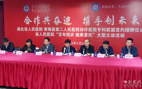 荆楚网(湖北日报网)讯(通讯员刘学平)4月23日,湖北省人民医院和黄梅县第二人民医院(孔垄镇卫生院)协作医院专科联盟签约授牌暨省人民医院“百年院庆 健康惠民”大型义诊活动在黄梅县孔垄镇举行。