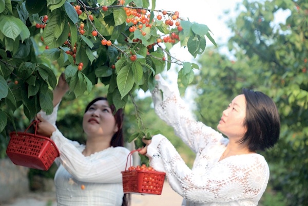 4月19日,在丹江口市凉水河镇贺家营村,十里樱桃谷硕果满枝,游人纷至沓来,体验采摘乐趣。贺家营村2018年引导农户新栽种樱桃树560余亩,打造出十里樱桃谷,预计年可接待游客3万余人次,户均年增收1万余元。