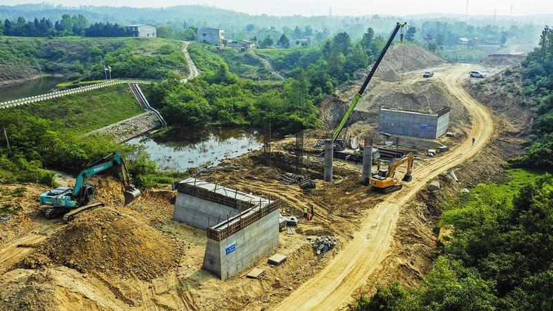 4月19日,随州南外环道路建设现场,工人们有的在架设桥墩、有的在铺设路基涵管、有的在挖掘拖运土石方,各种工程车来回穿梭,一派热火朝天的建设景象。