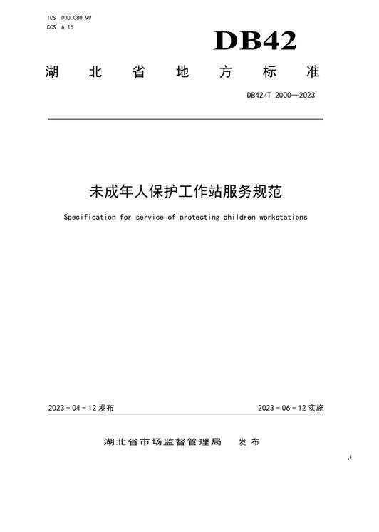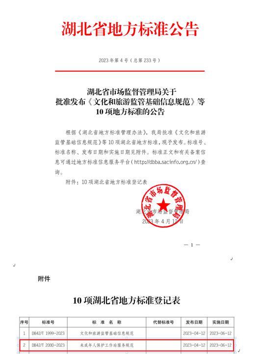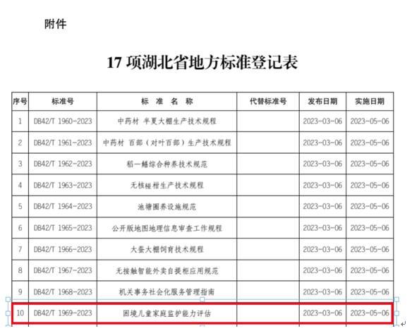 近日,荆州市未成年人社会保护中心牵头起草编制的湖北省地方标准《困境儿童家庭监护能力评估》(DB42/T1969-2023)《未成年人保护工作站服务规范》(DB42/T2000-2023)正式发布。这对推动未成年人保护工作走深走实,加强未成年人社会保护标准化体系建设有着重要意义。
