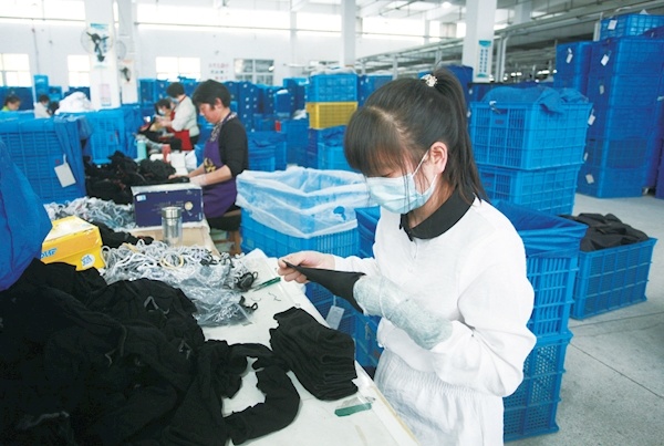 4月18日,在位于郧阳区刘洞镇的湖北高朋针织有限公司现代化生产车间内,工人正在抓紧生产订单产品。该公司吸纳300余名村民就业,日产高档棉袜15万双,产品远销英国、日本、韩国、德国、法国、意大利、俄罗斯等国,年产值预计可达1亿元。记者潘世新通讯员周岩摄