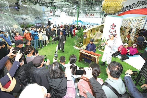 十堰馆内,武当道乐与武术表演吸引大批游客观赏。