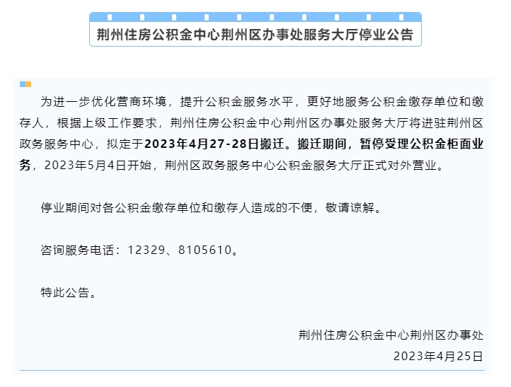 为进一步优化营商环境,提升公积金服务水平,更好地服务公积金缴存单位和缴存人,根据上级工作要求,荆州住房公积金中心荆州区办事处服务大厅于2023年4月27日搬迁至荆州区政务服务中心,自2023年5月4日正式对外受理业务,请各缴存单位和缴存人相互转告。