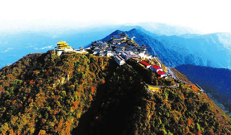 “金顶”为大慈恩寺核心建筑,由清华大学古建专家领衔设计。铜工艺由中国铜雕领域国家级工艺美术大师倾力打造。金顶是宝珠峰的制高点之一,总建筑面积达1200平方米,纯铜建造,用铜量120吨,高度为15.9米,多项数据列全国第一。