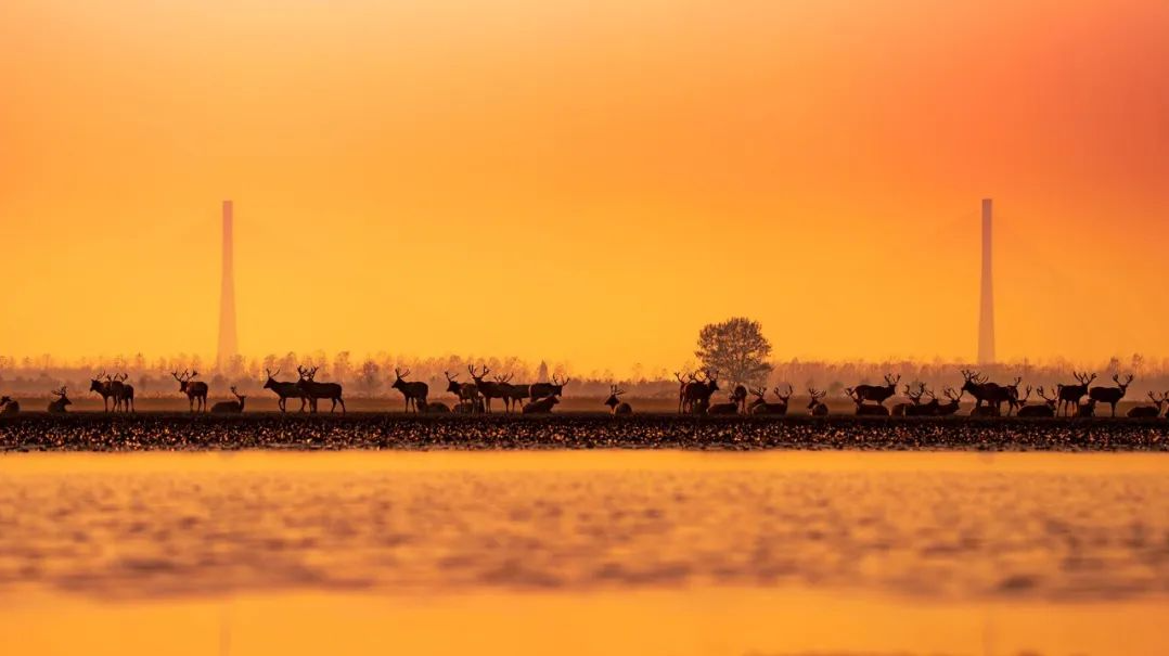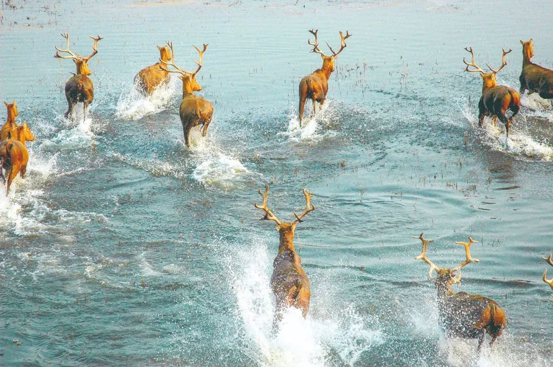 离春分节气还有几天,走在天鹅洲上,春天气息比别处更浓。在二〇〇八年的雨雪冰冻灾害中、被破冰船引入保护区网箱进行救治的雄性江豚天天、领着儿子在离得不远不近的水面上往复跳跃,毫不理会经我们的手抛入水中的一条条小鱼。那位因饲养江豚而成为网红的朴素男子,一边说还不到喂食的时间,一边也抛下几条不被搭理的小鱼,证明江豚没有欺生。一同获得救护的那只名叫娥娥的雌性江豚,伤愈之后,与雄性江豚天天做了夫妻,接连产生两只幼崽。二〇二〇年六月十日,刚生下二宝的娥娥,受到雷鸣电闪的惊吓,像是得了产后忧郁症,丢下幼子与夫君,做了天鹅洲上动人的传说。离开水线时,离开嬉戏不止的江豚父子,穿过几处树林,眼前出现大群的麋鹿。数了一阵,实在数不过来,问一旁的保护区工作人员,对方扫了一眼,说是有三百头左右,接着又补充说,刚才前面还有一群,比这一群更多。天鹅洲保护区这里的麋鹿有一千八百多头,眼前的三百多头,正在安逸地牧草,表面上并不在乎有人,只要有人走近一步,麋鹿群绝对会后退两步。人走上十步,麋鹿群绝对要后退二十步。当我们想进一步走近时,麋鹿们开始拉开距离,带着轻微的尘雾,消失在一条干涸的小河那边。