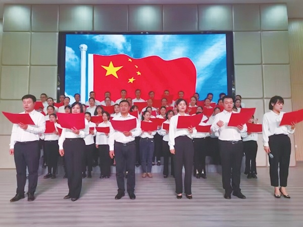 4月20日,郧阳思源实验学校举行了师生经典诗文诵读展演活动,56名教师齐诵《把奋斗写在党旗上》。通讯员熊巍摄