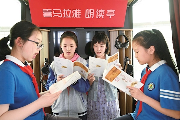 茅箭区实验学校师生在该校读书亭诵读经典。通讯员靳书敏摄
