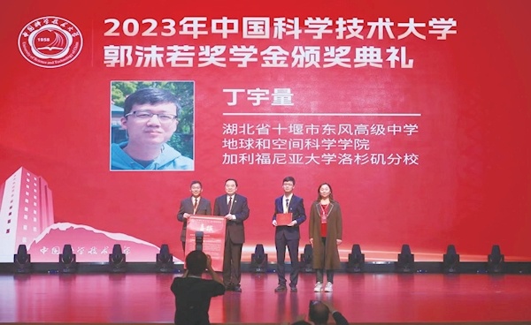 本报讯 记者叶楚榕通讯员 潘峰郑华 报道:“贵校2019届毕业生丁宇量同学荣获中国科学技术大学第四十二届‘郭沫若奖学金’,特向贵校致以热烈的祝贺和崇高的敬意!”——这是一份来自中国科学技术大学的喜报。4月22日下午,2023年郭沫若奖学金颁奖典礼在这所世界知名大学隆重举行。典礼现场,中国科学技术大学校长、中国科学院院士包信和为丁宇量颁发荣誉证书,并向东风高级中学发来喜报。