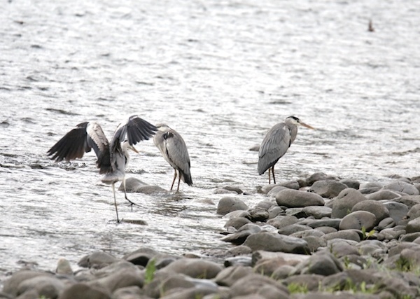 日前,竹山的观鸟爱好者在堵河流域拍到了3只苍鹭在河滩上觅食嬉戏的场景。