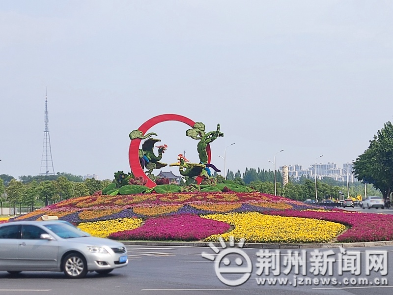 为迎接五一,在东环路交通岛位置,大型绿雕《凤鸣楚天》下部已重新栽植了12万盆色彩缤纷的时令草花,绿雕选用凤凰作为主体,荷花造型为底座,水浪纹形装饰凸显水乡特色,与古城美景相得益彰。