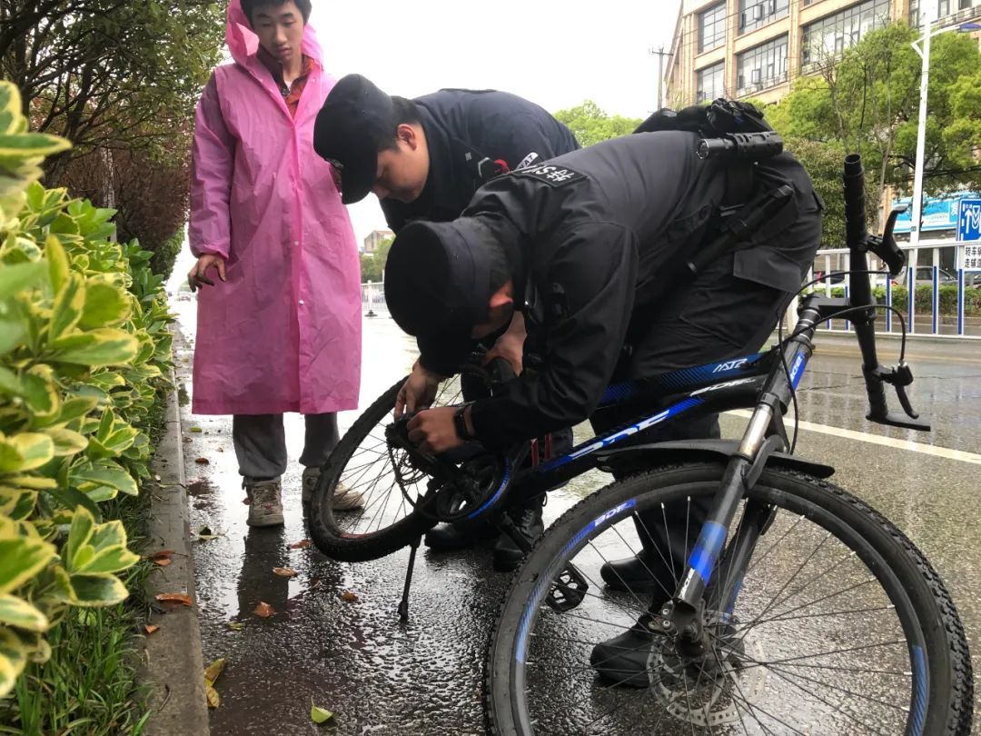 “那个行人自行车链条好像掉了”,上午11:20,队员巡逻途中发现一名群众在路边摆弄着自行车链条。“愣着干什么,快下去帮忙!”,连绵的阴雨不仅焦虑了群众的心情,也让链条裹满泥沙“面目全非”,顾不上脏,队员们立即上手帮忙。功夫不负有心人,看到特警队员黑漆漆的双手让链条与齿轮重归于好,群众的脸上逐渐泛起笑容,连声感谢特警队员的帮助。