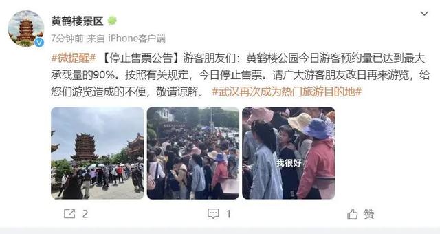 游客朋友们:黄鹤楼公园今日(5月1日)游客预约量已达到最大承载量的90%。按照有关规定,今日停止售票。请广大游客朋友改日再来游览,给您们游览造成的不便,敬请谅解。