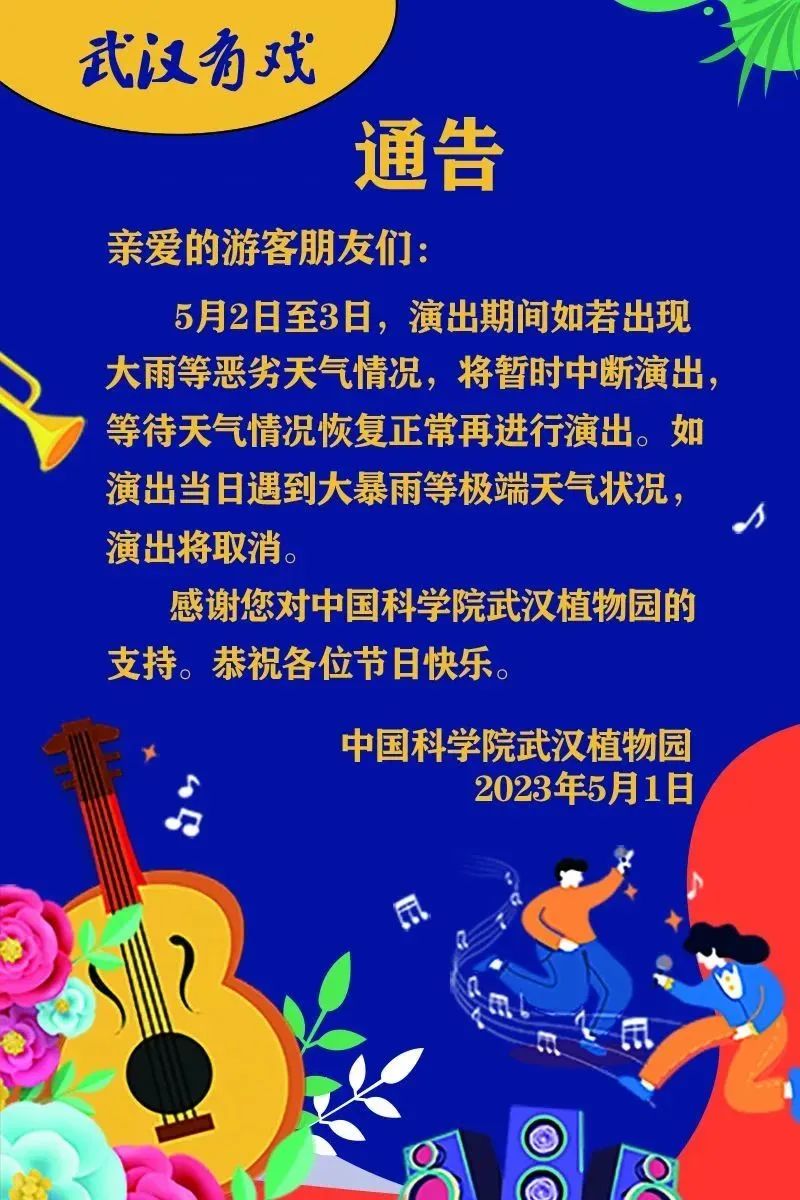 除武汉歌舞剧院的歌舞剧表演受此影响外,其他游玩项目暂无影响。请各位游客留意本地预警预报信息,注意出行安全。