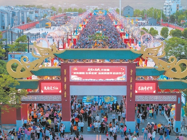 4月30日晚,“武当不夜城”开街暨“游购郧阳·乐享老家”休闲消费季启动仪式在郧阳区柳陂镇龙韵村举行,吸引8万余名游客前来游玩。“武当不夜城”项目是鄂西北地区首个乡村沉浸式夜游文旅项目,集时尚演艺、数字互动、沉浸光影、美食小吃、潮玩商业、衍生文创等为一体,成为“五一”假期十堰城郊热门旅游目的地。记者黄河杨柳摄