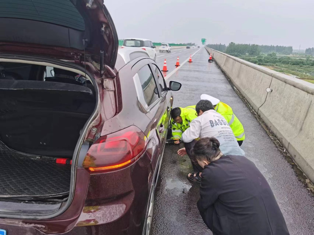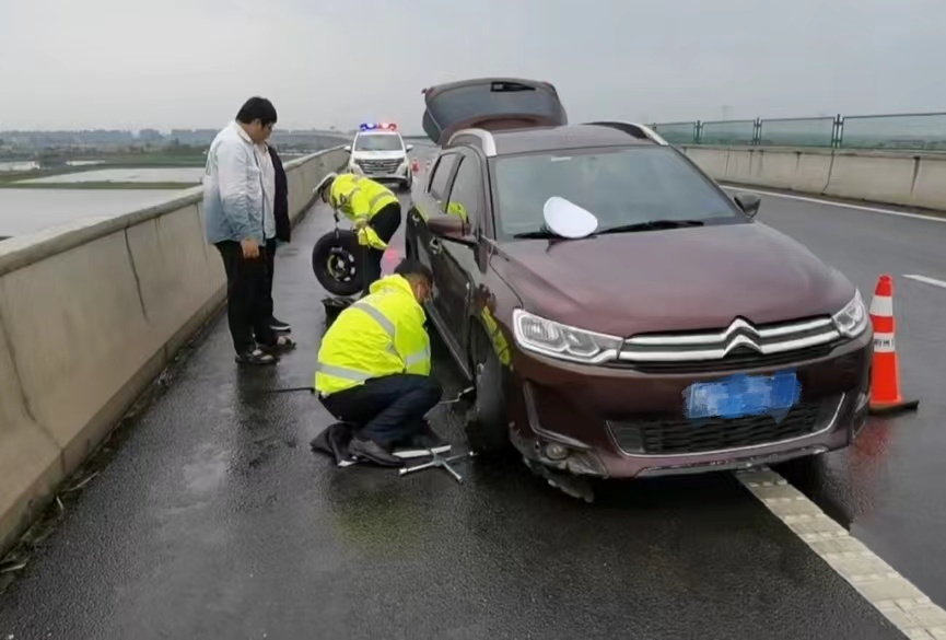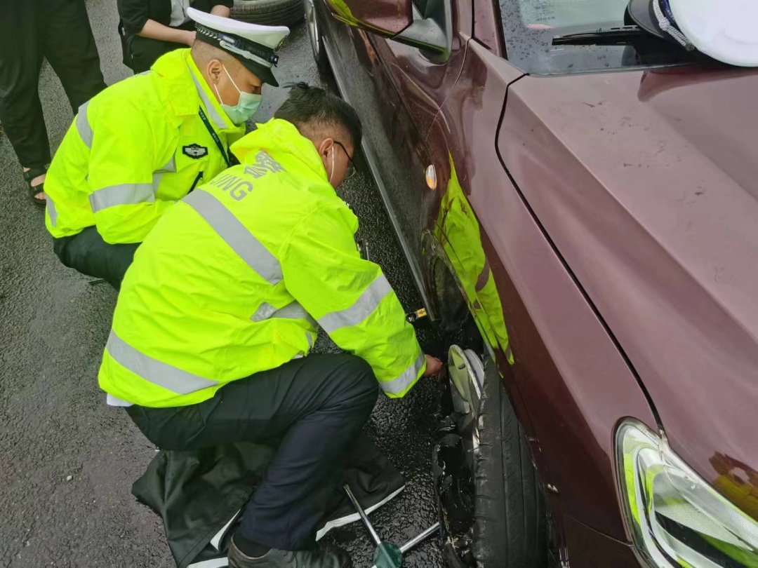 民警立即将车停靠在应急车道,做好现场安全防护后下车查看。见两男子正蹲在车辆右前侧轮胎处,便询问其情况,驾驶员称其从荆州驾车回武汉工作,车辆在高速公路行驶了一段距离后,突然爆胎了,好在当时车速不快,就缓慢地将车停在了应急车道。