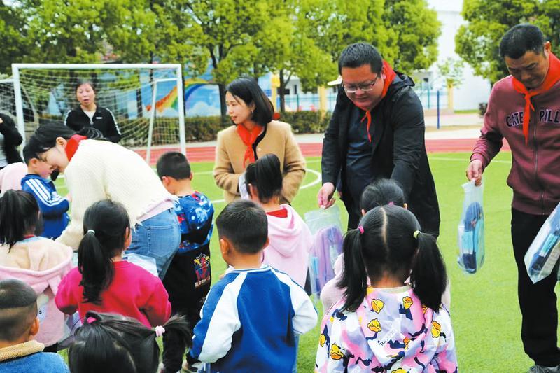 4月27日,随州市城市规划勘测设计研究院组织20余名党员干部,到曾都区府河镇五四小学开展志愿服务活动,为师生送去学习用品和体育用具。(随州日报全媒记者张清、通讯员李柚摄)