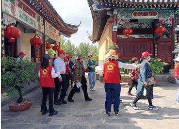 关羽祠景区的志愿者们一大早到岗,他们维持现场秩序、热心为广大游客提供咨询、景区介绍、道路指引、文明行为引导等服务,为广大游客打造安全有序文明祥和的文化旅游环境,确保游客们能度过一个愉悦舒适的假期。