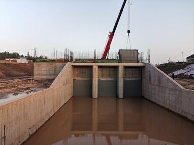 新建观音寺闸为穿堤箱涵式3孔涵闸,为灌溉引水闸,设计流量65.7立方米每秒。分工作闸门和事故闸门2道闸门,工作闸门和事故闸门各3扇。闸门孔口尺寸5.0×4.0米,闸门形式为潜孔平面定轮钢闸门,工作闸门单块自重18吨,事故闸门单块自重10吨。安装前,由设计、施工方项目部同金属结构安装公司商定最优的安全吊装方案,在闸区修筑了临时便道并铺设钢板,利用50吨吊车吊装闸门。为保证闸门柔性止水效果,闸门在安装后进行橡皮止水的调整。经运行试验,闸门滑轮与门轨机动灵活无卡阻,运行顺畅,止水密封性好,各项指标符合设计要求。