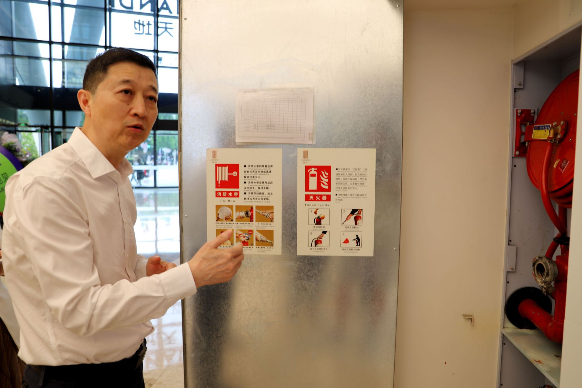 商场发生火灾,你知道在哪里可以找到“救命神器”吗?直播中,黄明教授揭秘,商场消防柜内藏着一瓶水,关键时刻能起大作用,可以用它来打湿衣物、掩住口鼻逃生。同时消防柜内还配备有水文灭火装置、干粉灭火器等,都是关键时救人救己的工具。