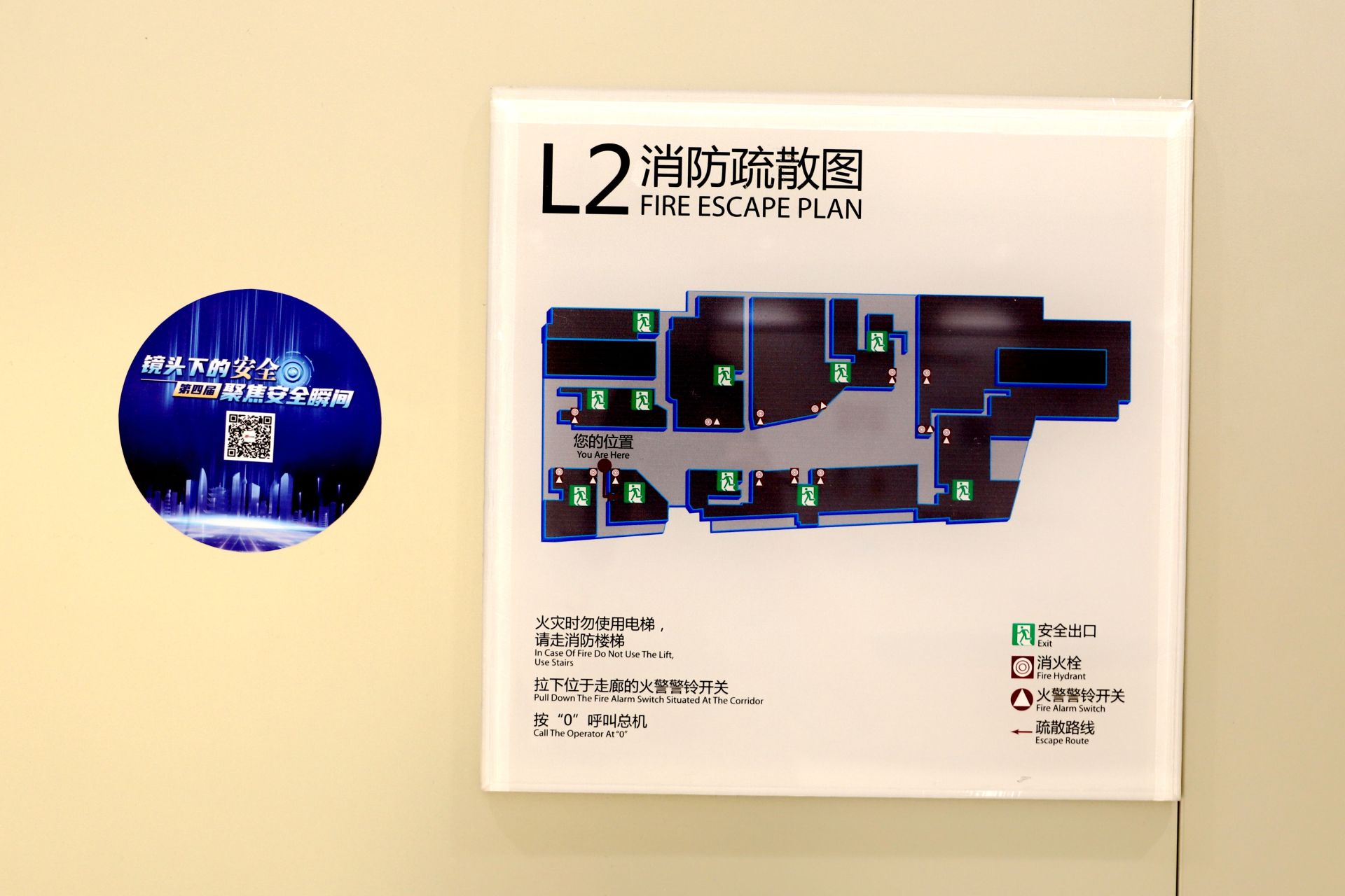 黄明教授在直播中特别提醒,商场每层楼都张贴有消防疏散图,可以和“小绿人”配套使用,它不仅让我们对自己所处的位置一目了然,还标注了所有安全通道的地点。墙面上有安全疏散图,地面上有安全逃生标志,商场安全逃生再也不会迷路了。