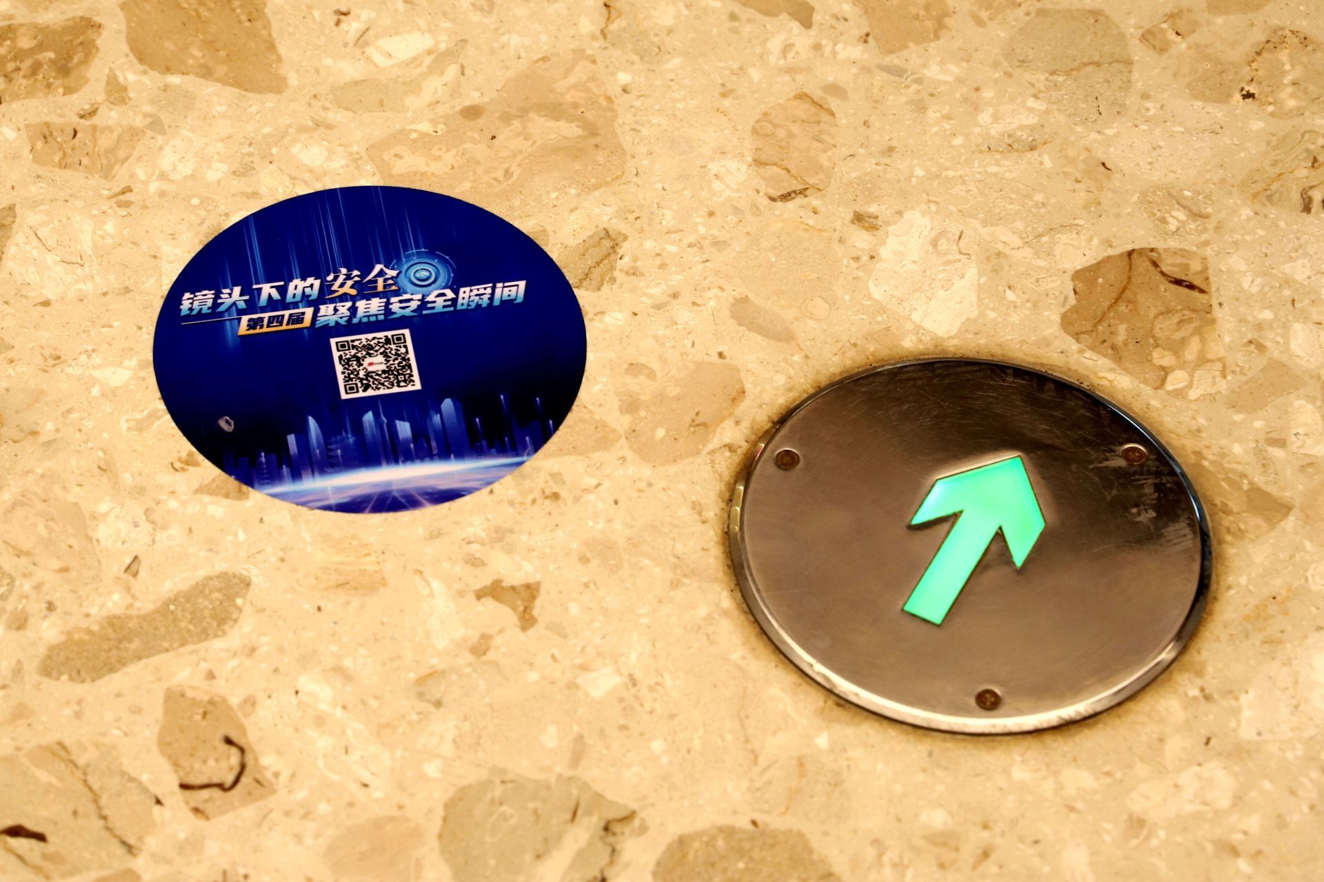 低头望望脚下,随即捕捉一只“小绿人”,这是火灾及应急情况下进行人员疏散的指示,以便第一时间逃离到安全区域。