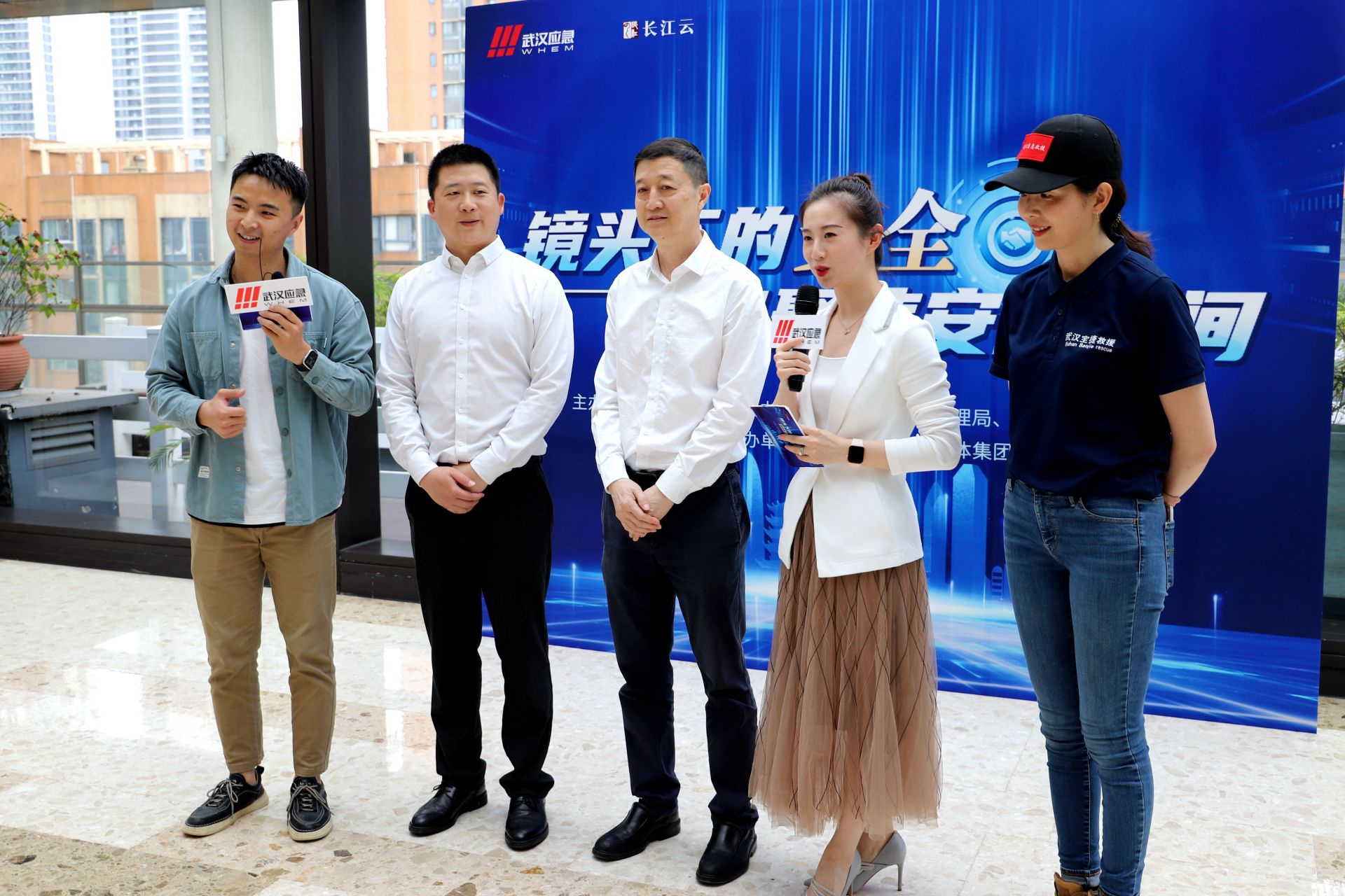 直播活动现场(左三:武汉理工大学副教授、武汉市应急管理专家库成员黄明,右一:武汉市江岸区宝捷救援队副队长、“武汉最美应急人”邓月婵)
