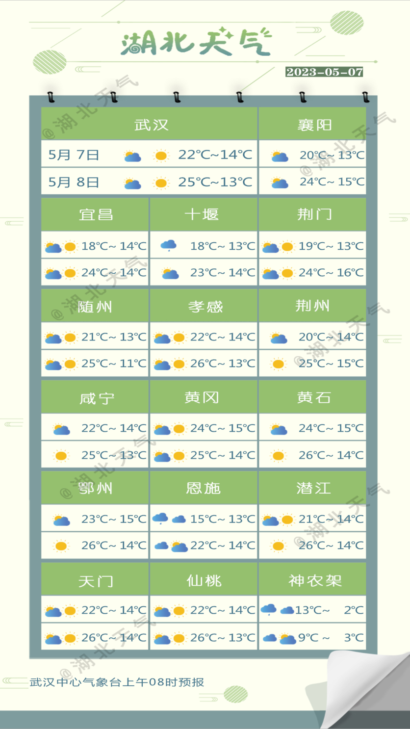 鄂东北、鄂东南多云,局部有零星小雨;其他地区多云转小雨。