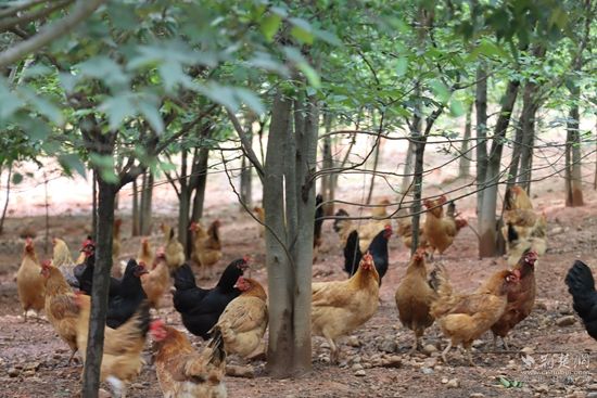 走在梓沐家庭农场里,绿树成荫,微风习习。“这是茶梅路,那边一条是桂花路,中间种的是三角枫,桂花路另一边是朴树以及一些果树。”王智越边走边介绍,农场充分利用空间发展林下经济,单独划分区域,在树下放养鸡鸭共计1000余只。