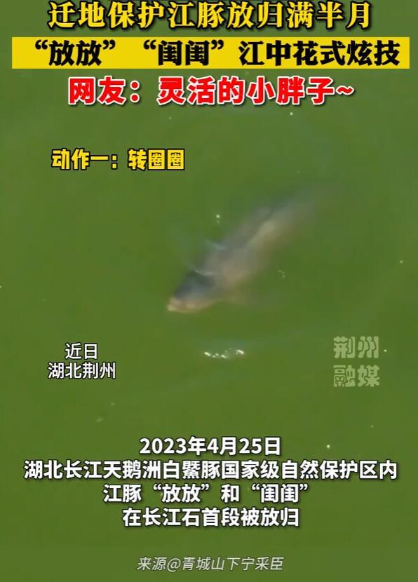 在水中欢快喷水转圈的就是13岁的雄豚“放放”和5岁的雌豚“闺闺”,他俩逐浪嬉戏,仿佛跳着水中华尔兹。今年4月25日,来自湖北石首长江天鹅洲白鱀豚国家级自然保护区的江豚“放放”和“闺闺”,在长江石首段被放归,这是“迁地保护江豚”全国首次放归长江,人类首次实现迁地保护濒危水生哺乳动物的野化放归。