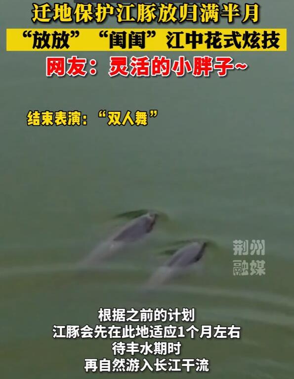 荆州新闻网消息(记者 徐雪晴)还记得江豚“放放”和“闺闺”吗?他俩是全国首次放归长江的江豚。5月8日,记者从石首长江天鹅洲白鱀豚国家级自然保护区带来了江豚的最新动态,“放放”和“闺闺”已经完全适应了现在的生存环境,还在江中跳起了“喷水”华尔兹。