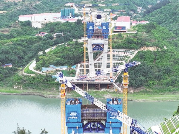 5月8日,在西十高铁汉江特大桥建设现场,施工人员正在建设两岸索塔。该桥全长917.45米,索塔高189米,主跨420米,总投资4.7亿元。西十高铁全长256.7公里,线路西起陕西省西安市,穿越秦岭,经商洛和十堰两市,与汉十高铁相接,形成西安至武汉快速铁路客运通道。特约记者周家山摄