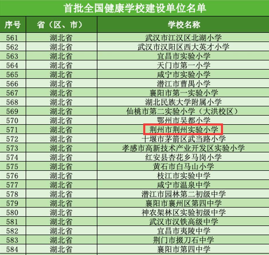 近日,教育部办公厅公示首批全国健康学校建设单位名单。公示名单显示,有1076所学校拟被确定为首批全国健康学校建设单位,湖北有50所学校入选,其中荆州5所学校入选。荆州具体如下: