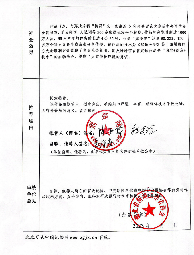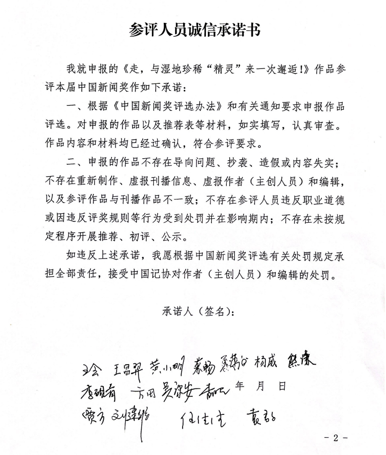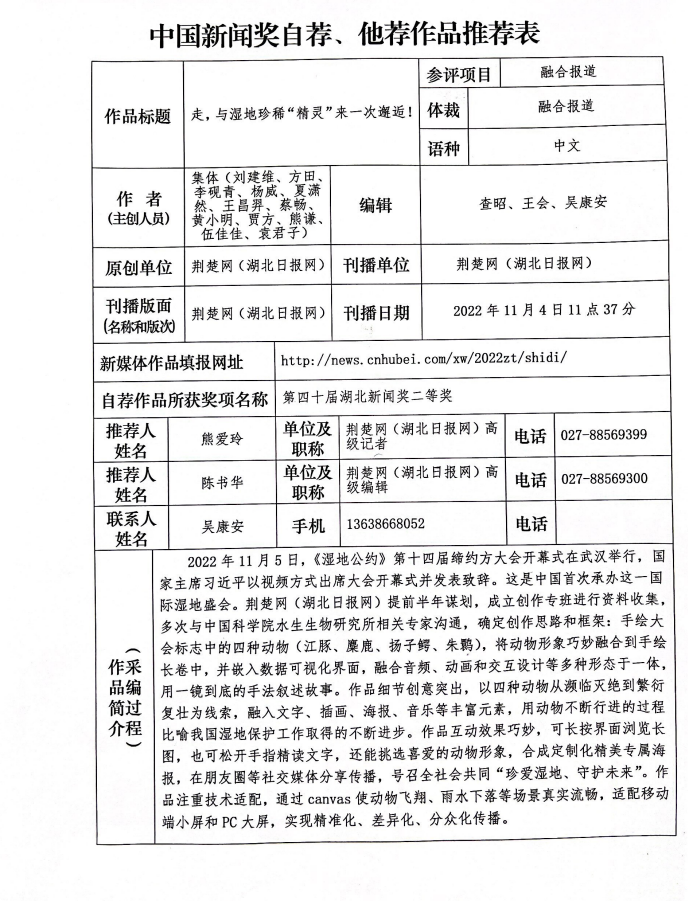 本人自荐《走,与湿地珍稀“精灵”来一次邂逅!》,参评第三十三届中国新闻奖,现将该作品进行公示。公示时间为2023年5月11日-5月17日。在此期间,社会各界可通过电话、传真或电子邮件等方式发表评议意见,逾期不再受理。