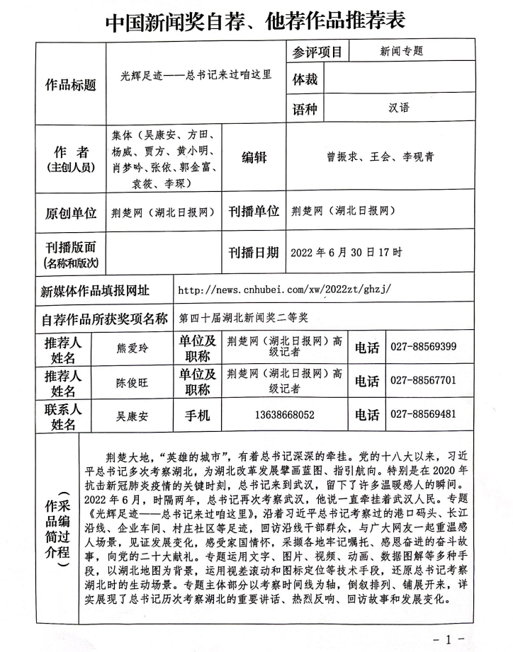 本人自荐《光辉足迹——总书记来过咱这里》,参评第三十三届中国新闻奖,现将该作品进行公示。公示时间为2023年5月11日-5月17日。在此期间,社会各界可通过电话、传真或电子邮件等方式发表评议意见,逾期不再受理。